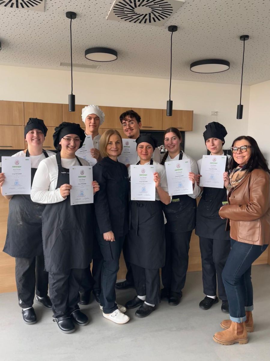 Sieben Schüler:innen der HLW19 – Straßergasse absolvierten erfolgreich die Zertifikatsprüfung zum Jungpâtissier/zur Jungpâtissière. Die Prüfung fand im Rahmen der unverbindlichen Übung Patisserie (48 Unterrichtseinheiten) statt.