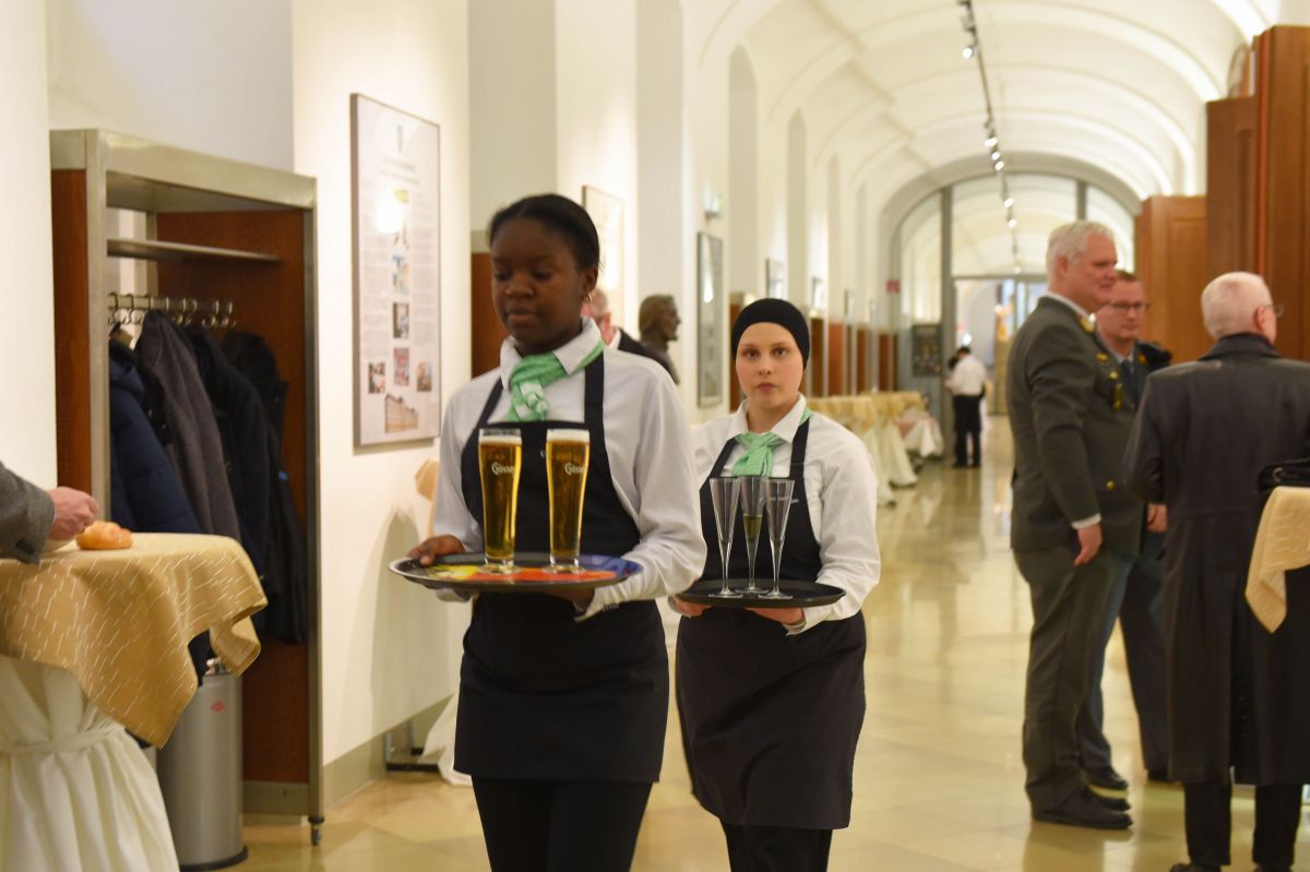 Auch ein exklusiver Sektempfang für hochrangige Ehrengäste, darunter Verteidigungsministerin Klaudia Tanner und weitere VertreterInnen des Bundesheeres, wurde von den SchülerInnen professionell betreut.